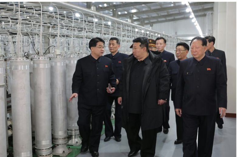 북한 노동신문이 지난 1월 29일 공개한 사진 속에서 북한의 김정은 국무위원장(왼쪽 두번째)이 정확한 위치가 알려지지 않은 '핵물질 생산 기지와 핵무기연구소'를 시찰하고 있다.뉴스1