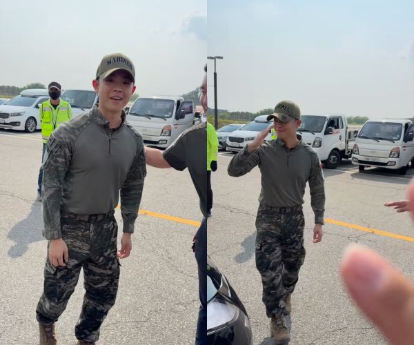 동영상에서 해병대 행사 현장에서 늠름해진 비주얼로 악수를 나누고 거수경례를 하는 등 멋진 해병대의 면모를 보여주고 있다.