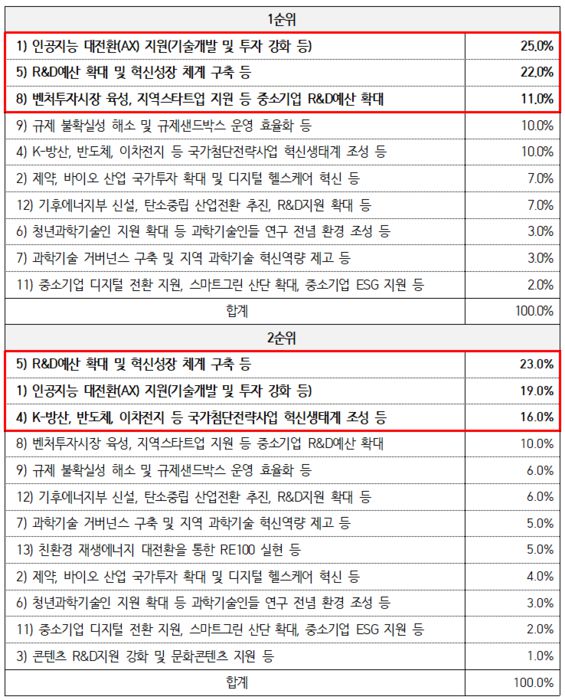 2순위는 'R&D 예산 확대 및 혁신성장 체계 구축(23%)' 'AI 대전환(AX) 지원(19%)' '국가첨단전략사업 혁신생태계 조성(16%)' 순이었다.