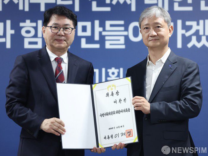 [서울=뉴스핌] 김학선 기자 = 이한주 국정기획위원회 위원장(왼쪽)이 16일 서울 종로구 정부서울청사 창성동 별관에서 열린 출범식에서 사회1분과장을 맡은 이찬진 제일합동법률사무소 변호사에게 위촉장을 수여한 뒤 기념촬영을 하고 있다.  2025.06.16 yooksa@newspim.com
