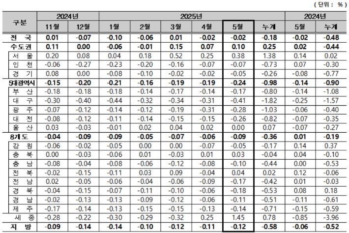 지난 3월 0.52%→4월 0.25%→5월 0.38%…인천과 경기, 지방은 하락세 지속