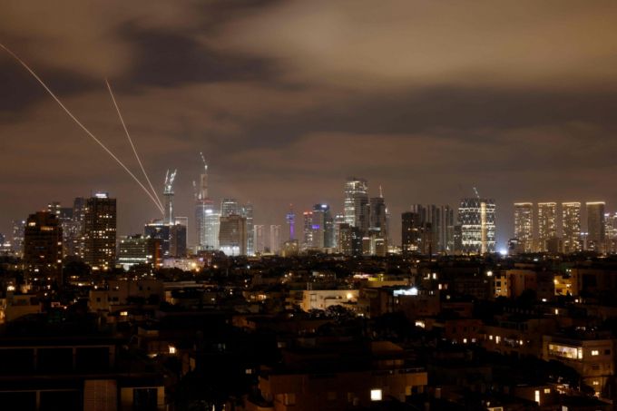 2025년 6월 15일, 이란의 로켓이 이스라엘 텔아비브 상공에서 발사된 가운데 이스라엘 방공 시스템이 가동되어 이란의 미사일을 요격하고 있다. /AFPBBNews=뉴스1 |