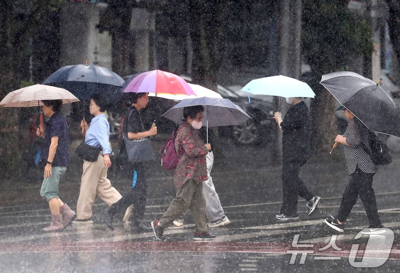 16일 오전 대구 수성구 달구벌대로에 많은 비가 쏟아지자 시민들이 우산을 펼쳐 비를 피하며 길을 건너고 있다. 2025.6.16/뉴스1 ⓒ News1 공정식 기자
