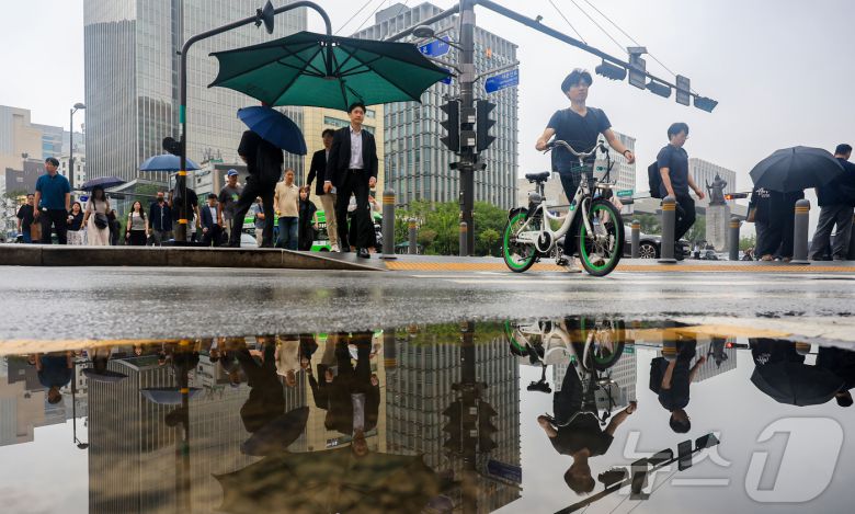 부슬비가 내리는 16일 오전 서울 종로구 광화문 네거리에서 시민들이 출근길을 서두르고 있다. 기상청은 이날 전국 대부분 지역에 비가 내리겠고, 내륙을 중심으로 낮 기온이 30도 안팎으로 오르는 등 덥고 습한 날씨가 예상된다고 밝혔다. 2025.6.16/뉴스1 ⓒ News1 김진환 기자 |