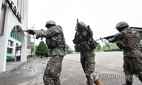 (광명=연합뉴스) 홍기원 기자 = 16일 경기도 광명시 노온정수장에서 화랑훈련의 일환으로 열린 통합방위훈련에서 육군 제51보병사단 장병들이 적 드론 공격 상황을 가정해 훈련하고 있다.