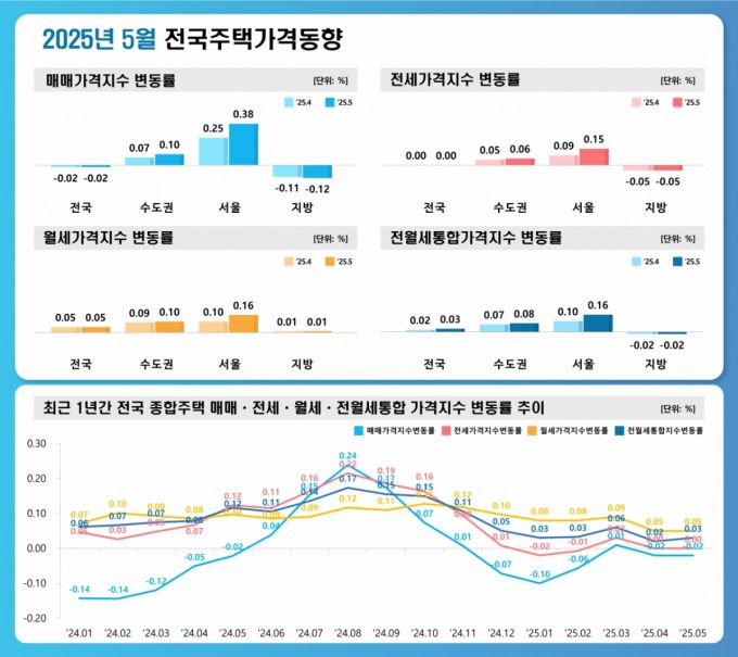 전국 주택 유형별 매매가격지수는 주택종합(-0.02%), 아파트(-0.03%), 연립주택(-0.03%) 모두 하락했고 단독주택은 0.08% 상승했다. 모든 유형이 상승한 서울은 아파트(0.54%), 주택종합(0.38%), 단독주택(0.22%), 연립주택(0.17%) 순으로 올랐다.