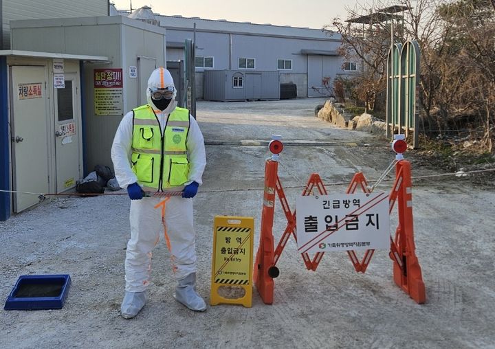 [청주=뉴시스] 21일 H5N1형 고병원성 조류인플루엔자(AI)가 확진된 충북 청주시 오송읍 동평리 산란계 농장의 출입이 통제되고 있다.(사진=충북도 제공) 2025.03.21. photo@newsis.com *재판매 및 DB 금지