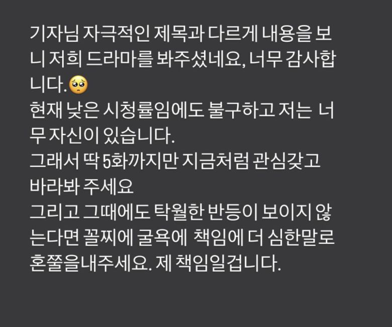 이에 대해 남궁민은 "기자님 저극적인 제목과 다르게 내용을 보니 저희 드라마를 봐주셨네요, 너무 김사합니다"라며 "현재 낮은 시청률임에도 불구하고 저는 너무 자신있습니다. 그래서 딱 5회까지만 지금처럼 관심갖고 바라봐주세요. 그리고 그때에도 탁월한 반등이 보이지 않는다면 꼴찌에 굴욕에 책임에 더 심한 말로 혼쭐을 내주세요. 제 책임일 겁니다"라고 직접 개인 계정에 글을 공유했다.