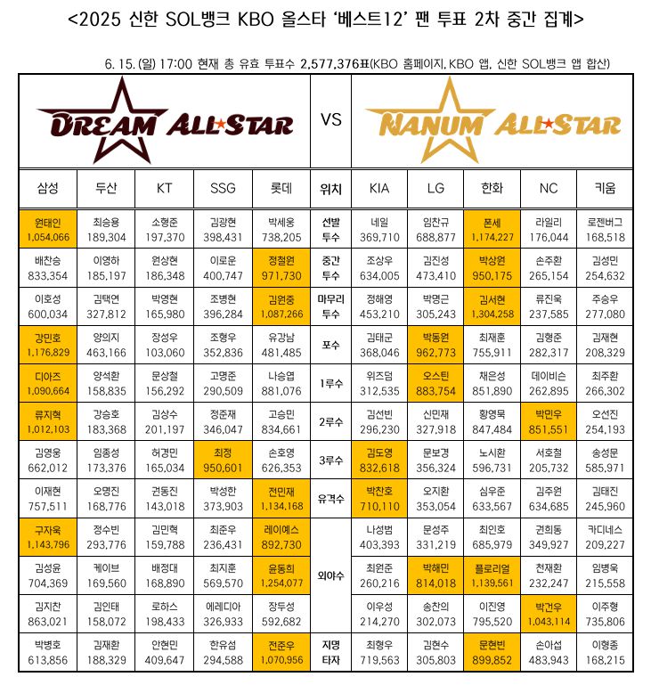 2024시즌에 이어 역대 2번째 전반기 600만 관중 돌파를 앞두고 있는 KBO리그의 열기는 올스타 팬 투표에도 이어지고 있다. 2차 중간 집계 결과 총 투표수 257만7376표로, 2024 올스타전 2차 중간 집계 때의 234만1719표 보다 약 10% 증가했다.