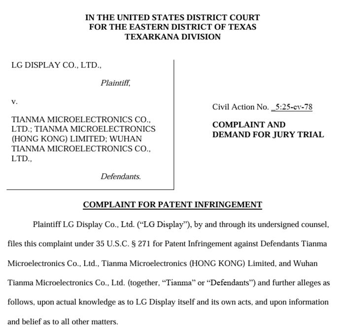 LG디스플레이가 중국 디스플레이 업체 티얀마를 상대로 미국 텍사스동부법원에 특허 7건을 침해했다며 소송을 제기했다. 사진은 소장. 〈자료 미국 텍사스 동부법원〉 |