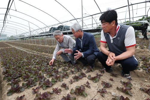 강호동 농협중앙회장(왼쪽)이 지난 13일 부산 강서구 대저동 상추 농가를 방문해 생육상황을 점검했다. [농협중앙회 제공] |