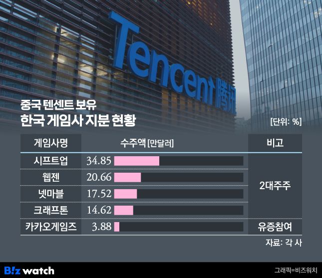 문제는 텐센트가 넥슨뿐 아니라 다양한 국내 게임사 지분을 대규모로 확보하고 상당한 영향력을 행사하고 있다는 점이다. 텐센트는 세계적 게임 '리그 오브 레전드'를 개발한 라이엇게임즈를 인수하는 등 글로벌 게임업계 M&A의 큰 손이기도 하다.