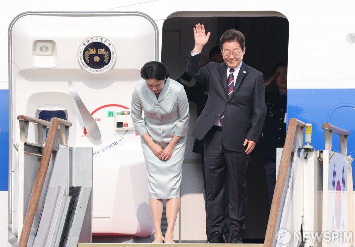 오후 4시 30분 이 대통령과 김 여사는 트랩을 올라 공군 1호기 앞에 선 뒤 참석자들을 향해 뒤돌아 손을 흔들며 인사했다. 이후 이 대통령 부부는 공군 1호기에 탑승하며 첫 순방길에 올랐다.