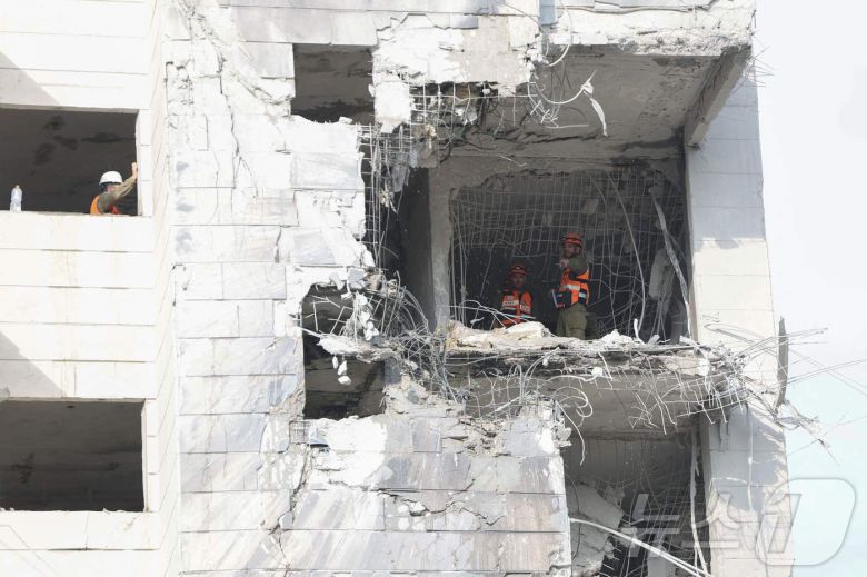 (페타 티크바 AFP=뉴스1) 권영미 기자 = 16일(현지시간) 이란의 미사일 공격을 받은 페타 티크바의 한 건물을 응급대원들이 수색하고 있다. 페타 티크바는 이스라엘의 사실상 수도인 텔아비브의 동쪽에 있는 도시다. 2025.06.16. ⓒ AFP=뉴스1