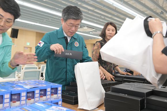‘폭염 키트’ 만드는 김길성 중구청장 - 김길성 중구청장이 여름철 주민을 위한 폭염 키트를 만들고 있다. 중구 제공