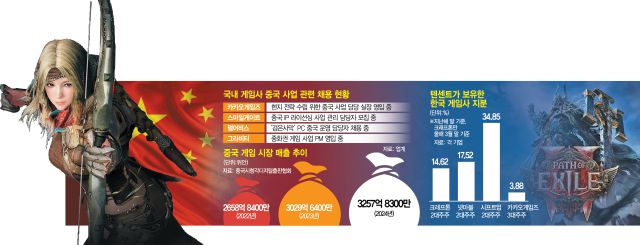 카카오게임즈 뿐만 아니라 다른 게임사들의 동향도 유사하다. 스마일게이트 중국 현지에서 자사 지식재산권(IP)을 활용한 콘텐츠 사업을 담당할 인력을 뽑고 있는 가운데 펄어비스(263750)도 ‘검은사막’ PC의 중국 운영 담당자를 채용 중이다. 그라비티 역시 중화권 게임 지표를 관리·분석할 수 있는 프로덕트 매니저(PM) 영입에 나섰다.
