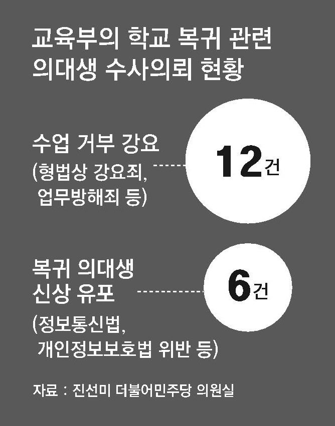 한편 국회 교육위원회 소속 진선미 더불어민주당 의원실이 교육부에서 받은 자료에 따르면 교육부는 지난해 3월부터 이달까지 의대 신고센터 접수된 피해 사례 18건을 수사기관에 의뢰했다. 수업 거부 강요 12건과 복귀 의대생 신상 유포 6건이다.
