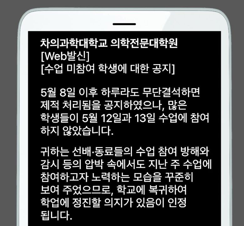 차의과대도 이 같은 사실을 확인하고 선배와 동료 강압에 못 이겨 출석하지 않은 학생은 제적 대상자에서 제외하기로 했다. 차의과대는 지난달 13일 ‘수업 미참여 학생에 대한 공지’를 통해 “수학 의지를 명확히 밝힌 학생의 경우 5월 12일부터의 결석은 무단결석이 아니라 외력에 의한 불가항력적 결석으로 간주하여 제적 대상자에서 제외하기로 하였다”고 밝혔다. 학교 측이 밝힌 외력은 ‘의대 선배·동료의 수업 참여 방해와 감시 등 압박’을 뜻한다.