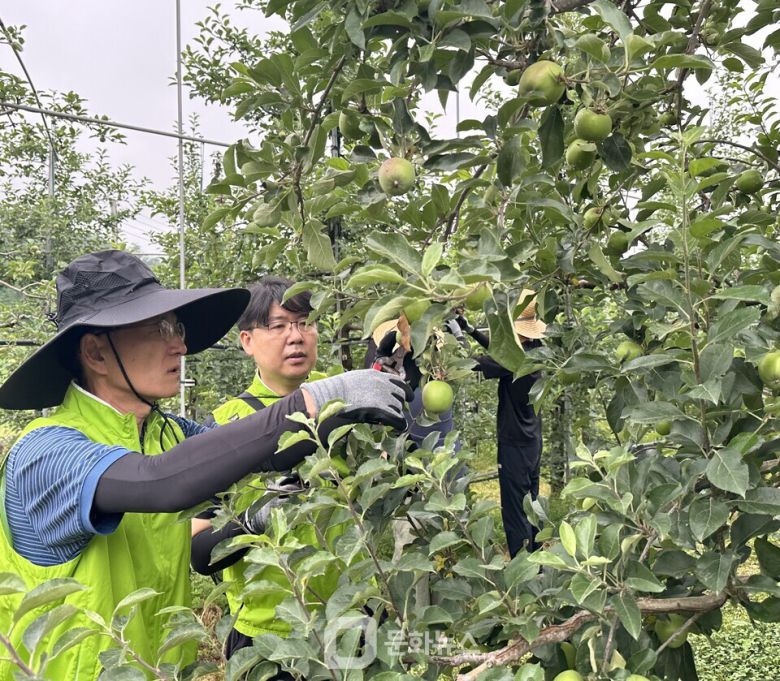 (문화뉴스 최연지 기자) 농협중앙회와 농협대학교는 16일 경기 파주시 민통선 내에 위치한 사과농가에서 '국민과 같이 농촌봉사활동'을 실시했다.