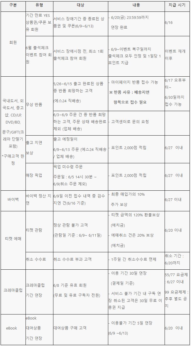 예스24는 이날 중 1차 보상안을 공지하고, 추후 홈페이지 공지사항을 통해 추가 보상안을 재안내할 계획이라고 설명했다.