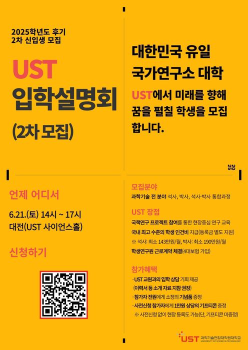 이번 설명회는 오는 21일 오후 2시부터 5시까지 UST 대학본부 사이언스홀에서 열리며 △ 2025학년도 후기 2차 모집요강 안내 △ 교원과의 1:1 입학상담 △ Q&A 등 다채로운 프로그램이 진행될 예정이다.