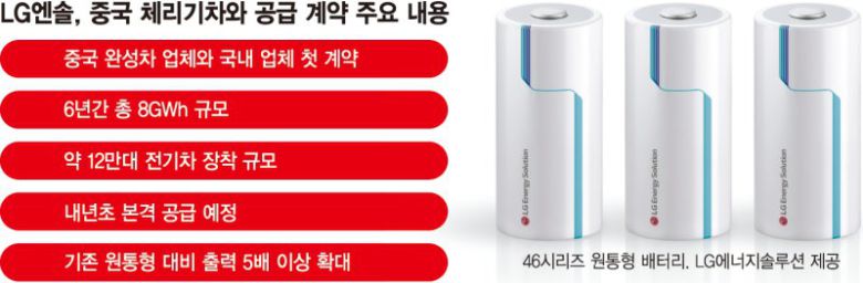 LG에너지솔루션이 중국 5대 자동차 제조사 중 하나인 체리기차(Chery Automobile)에 46시리즈 원통형 배터리를 공급한다. 국내 배터리 업체 중 최초로 중국 완성차 업체와 대규모 원통형 배터리 공급 계약을 체결한 것이다. 업계에선 최소 1조원 이상 규모의 계약으로 추정하는 가운데, LG에너지솔루션은 내년 초부터 본격적으로 공급을 시작할 예정으로, 전기차 캐즘(일시적 수요 정체)에도 46시리즈에 대한 적극적인 투자로 글로벌 주요 완성차 업체와 협력을 확대한다는 방침이다.
