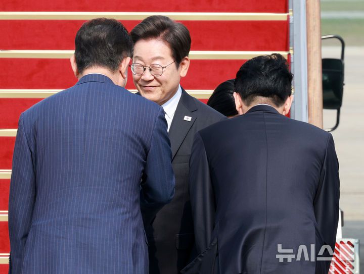 [성남=뉴시스] 고범준 기자 = 이재명 대통령과 김혜경 여사가 캐나다에서 열리는 주요 7개국(G7) 정상회의에 참석하기 위해 16일 경기 성남 서울공항에서 공군 1호기 탑승하기 전 김병기 더불어민주당 당대표 직무대행 겸 원내대표와 인사하고 있다. 2025.06.16. bjko@newsis.com