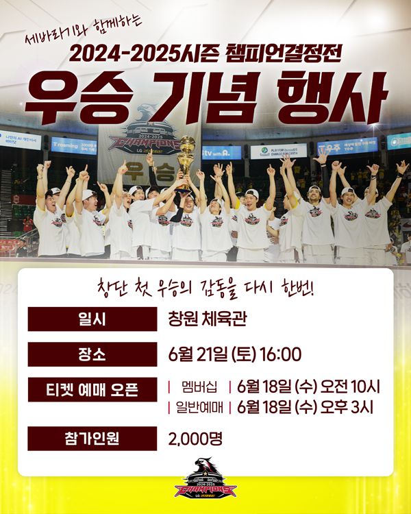 [스포츠투데이 이상필 기자] 창단 첫 우승을 차지한 창원 LG 세이커스가 오는 21일 잠실학생체육관 원정경기에서 맞이한 구단 역대 최초 챔피언결정전 우승의 기쁨을 더 많은 창원 팬들과 나누기위해 홈 경기장인 창원체육관에서 우승 기념 행사를 진행한다.