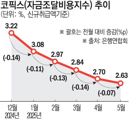 16일 은행연합회에 따르면 5월 신규 취급액 기준 코픽스는 2.63%로 전월 대비 0.07%포인트(p) 하락했다. 2022년 6월(2.38%) 이후 최저치다. 한국은행이 기준금리를 내리기 시작한 지난해 10월부터 계속 하락세다.