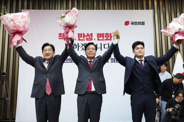 ▲국민의힘 신임 원내대표로 당선된 송언석 의원이 16일 원내대표 선출 의원총회가 열린 국회 회의장에서 권성동 전 원내대표, 김용태 비상대책위원장과 기념촬영을 하고 있다. ⓒ연합뉴스 |