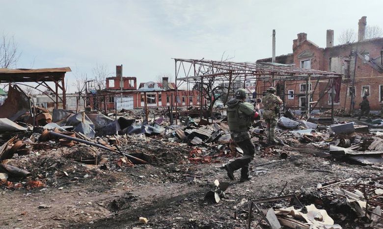 지난 3월 중순 러시아 군인들이 우크라이나군으로부터 탈환한 쿠르스크주 수드자 지역의 폐허가 된 거리를 정찰하고 있다. AP연합뉴스 |
