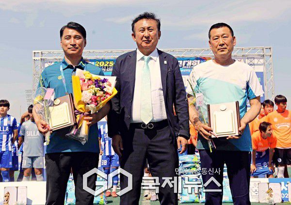 (군산=국제뉴스) 김병용 기자 = 전북축구협회 한동훈 여성분과이사와 군산시축구협회 전태진 시설이사가 12일 군산시 월명종합경기장에서 열린 2025 금석배 전국고등학생축구대회 시상식에서 전북축구협회 서강일 회장으로부터 공로패 수상의 영광을 안았다.