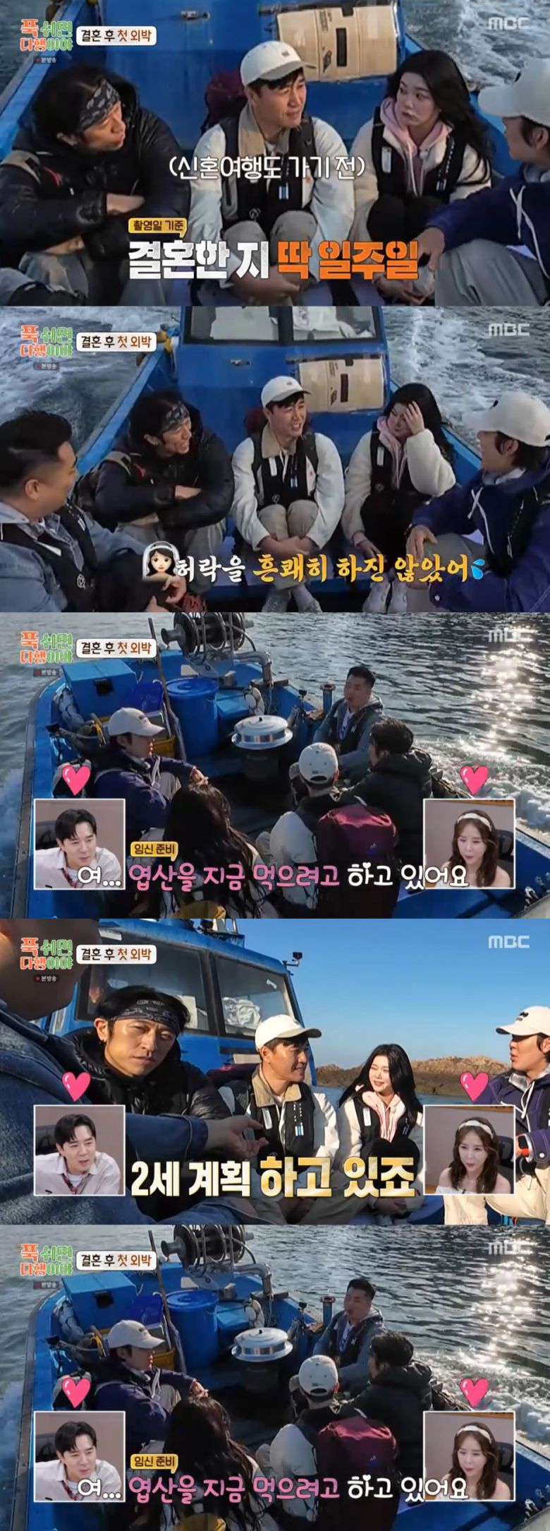 김종민은 결혼한 지 딱 일주일이 지난 시점 촬영에 참여했는데, 첫번재 외박이라고 전했다. 박태환은 "그래도 외박하면 안 되잖아요. 너무 신혼인데"라며 걱정하자, 김종민은 "허락을 흔쾌히 하지는 않았다. 신혼인데 왜이렇게 나가냐고"라고 말해 웃음을 자아냈다.