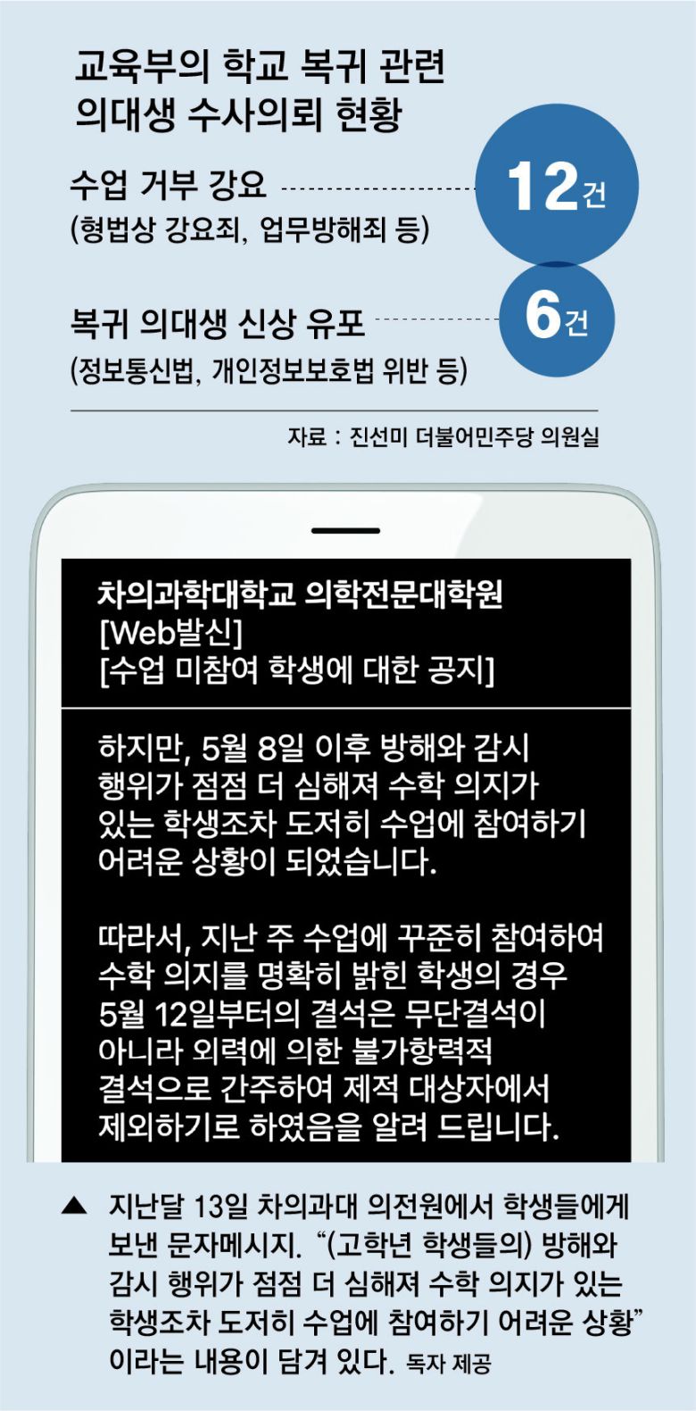 한편 국회 교육위원회 소속 진선미 더불어민주당 의원실이 교육부에서 받은 자료에 따르면 교육부는 지난해 3월부터 이달까지 의대 신고센터에 접수된 피해 사례 18건을 수사기관에 의뢰했다. 수업 거부 강요 12건과 복귀 의대생 신상 유포 6건이다.