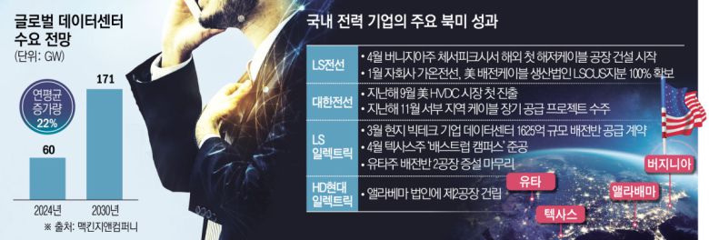 이에 국내 전력 기기 기업들은 북미 시장에 집중 투자를 이어가고 있다. LS전선은 4월부터 미국 버지니아주 체서피크시 39만6700m² 부지에 연면적 7만m² 규모로 해저케이블 제조 공장을 짓고 있다. LS전선이 해저케이블 공장을 해외에서 짓는 첫 사례다. 투자 규모는 총 6억8100만 달러(약 1조 원)에 달한다. LS전선은 해당 공장을 2027년 3분기에 완공해 2028년 1분기부터 양산을 시작한다는 목표다.