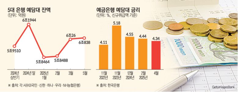 최근 금리 상황도 예담대 증가에 영향을 미쳤다. 한국은행 경제통계시스템에 따르면 올해 4월 기준 예담대 평균 금리는 연 4.34%로 2022년 11월(연 4.11%) 이후 약 2년 5개월 만에 가장 낮은 수준을 기록했다. 기준금리 인하와 함께 시중은행의 수신금리가 낮아지면서 예담대 금리 역시 하락한 것이다. 시중은행들도 정기예금 및 적금 금리를 잇달아 인하하고 있어 수신금리에 연동된 예담대 금리 역시 추가 하락할 가능성이 있다.