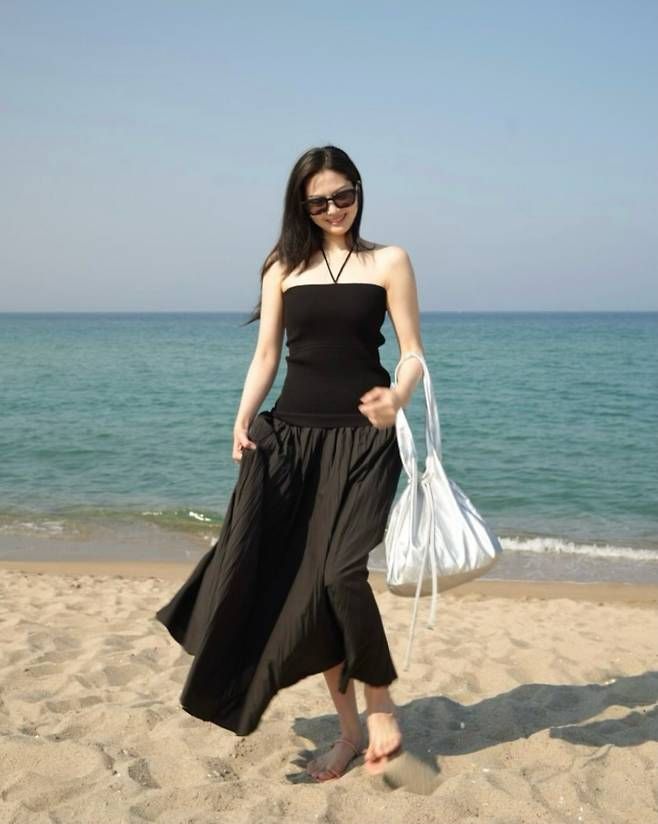 사진 속 류이서는 블랙 홀터넥 탑과 하늘하늘한 플레어 롱스커트를 매치해 단아하면서도 모던한 리조트룩을 완성했다. 여기에 실버 컬러 복조리 형태의 빅백을 포인트로 더하며 도시적 감각을 놓치지 않았다.