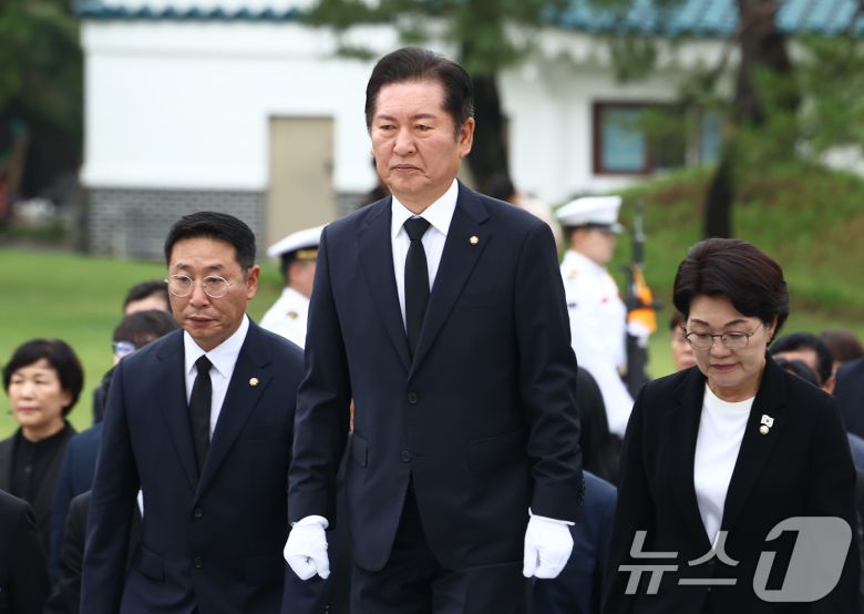 더불어민주당 당대표 출마를 선언한 정청래 의원이 16일 오전 서울 동작구 국립서울현충원에서 현충탑에 참배하기 위해 이동하고 있다. 2025.6.16/뉴스1 ⓒ News1 김민지 기자