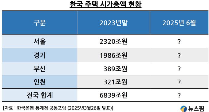 한국은행 및 통계청 자료에 따르면 2023년말 기준 서울 주택 시가총액은 2320조원이다. 2024년말의 한국 증시 전체 시가총액과 비슷한 수준이다. 경기도 주택 시가총액은 1986조원으로 이 2개 지역만 합쳐도 4306조원이다. 전국 주택 합계 시가총액 6839조원의 63%를 차지하고 있다.
