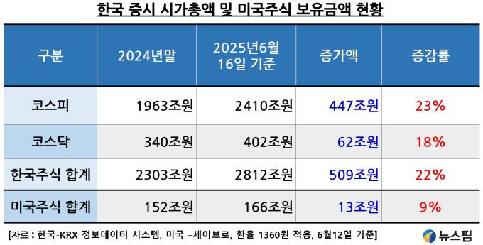 2024년말 기준 한국 증시 시가총액은 2303조원(코스피+코스닥)이다. 2025년 6월 현재는 2812조원으로 무려 509조원이 급증했다. 전년말 대비 22% 급증한 셈이다. 반면 한국인의 미국 주식 보유금액은 2024년말의 152조원(1121억달러)에서 2025년 6월 현재는 166조원(1217억달러)로 13조원(9%) 증가하는 데 그쳤다.