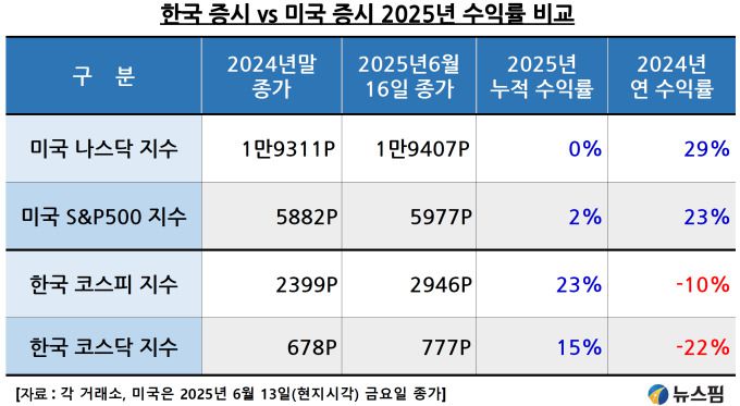 실제 올해 상반기 '한국 주식 vs 미국 주식' 수익률 대결은 한국 주식의 완승이다. 올해 미국 나스닥 지수 상승률은 0%대에 그쳤다, 미국 S&P500 지수 상승률도 2%대에 불과하다. 반면 한국 코스피 지수는 23%, 코스닥 지수는 15% 폭등했다. 작년과는 완전히 반대되는 결과다.