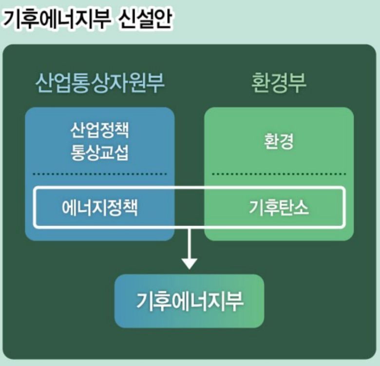이재명 정부가 기후위기 대응을 위해 만들겠다고 한 ‘기후에너지부’는 과연 어떻게 될까. 신설 부처의 밑그림은 앞으로 국정기획위원회 활동 과정에서 구체화되겠지만, 산업부의 에너지 조직과 환경부의 기후탄소실을 통합하는 방안이 유력하게 점쳐진다. ‘진흥’과 ‘규제’가 한 몸에 담기게 되는 셈이다. 이 대통령의 공약 마련에 핵심적으로 참여한 더불어민주당 관계자는 한겨레에 “그동안 힘센 기획재정부나 산업부가 힘 약한 환경부 얘기를 잘 안 들었다. 한데 (기후에너지부 신설로) 기능이 통합되면 과거보다 더 효과적으로 정책을 추진할 수 있을 것”이라고 했다. 홍종호 서울대 환경대학원 교수는 “업무로 연결된 다양한 부처들이 몽니 부리지 않게 충분히 통합하는 데에 새 부처의 성패가 달렸다”며 “결국 대통령의 의지와 조율이 가장 중요하다”고 조언했다.
