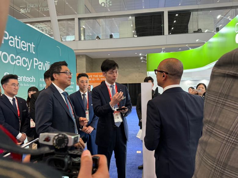 이후에는 다른 회사들의 부스를 방문했다. 신 실장은 먼저 동아쏘시오그룹 공동부스에서 박재홍 동아에스티 R&D 총괄사장, 성무제 에스티팜 대표, 최경은 에스티젠바이오 대표 등과 만났다. 성 사장은 에스티팜의 항체약물접합체(ADC) 사업에 대해 언급하며 “기회가 되면 사업 협력도 가져보자”고 말했다.