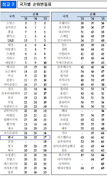 경제성과(16→11위), 정부효율성(39→31위) 부문 순위는 상승했다.