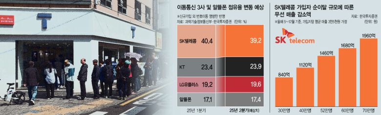 상황이 달라진 건 에스케이텔레콤 유심 정보 유출 사고가 불거진 뒤다. 정보 유출이 공개된 4월22일부터 이달 8일까지 에스케이텔레콤에서 케이티와 엘지유플러스 등 다른 통신사로 이탈한 가입자 수는 52만1741명이다. 에스케이텔레콤의 사고 대응에 실망한 가입자들이 번호이동 때 내야 하는 위약금을 회사가 면제해주지 않았음에도 불구하고 이미 50만명이 넘게 빠져나간 셈이다. 업계에선 에스케이텔레콤이 지난 10년간 지켜온 휴대전화 회선 점유율이 올 2분기 40% 아래로 떨어졌을 것으로 보고 있다. 지난달 5일부터 한 달 넘게 신규 영업이 중단된 게 결정적 영향을 끼쳤다. ‘업계 1위’를 사수하려는 에스케이텔레콤은 경쟁사에 빼앗긴 가입자를 올 하반기 동안 되찾아와야 하는 상황이 됐다.