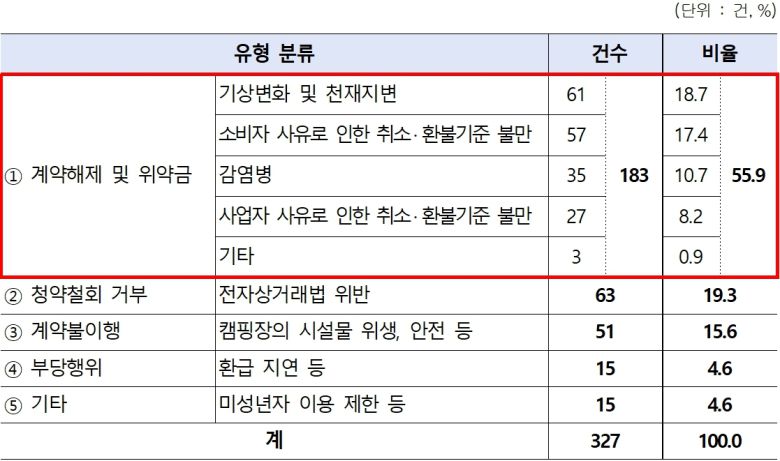 이어 캠핑장 위생 불량과 단수·난방시설 고장 등 계약불이행이 15.6%(51건), 추가 요금 등 부당행위가 4.6%(15건)였다.