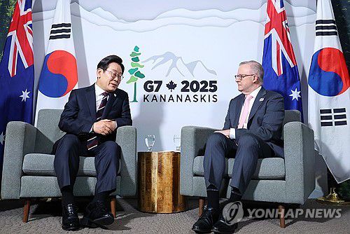 (캘거리[캐나다]=연합뉴스) 홍해인 기자 = 51차 주요 7개국(G7) 정상회의에 참석한 이재명 대통령이 16일(현지시간) 캐나다 앨버타주 캘거리의 한 호텔에서 앤서니 앨버니지 호주 총리와 한·호주 정상회담을 하고 있다. 2025.6.17