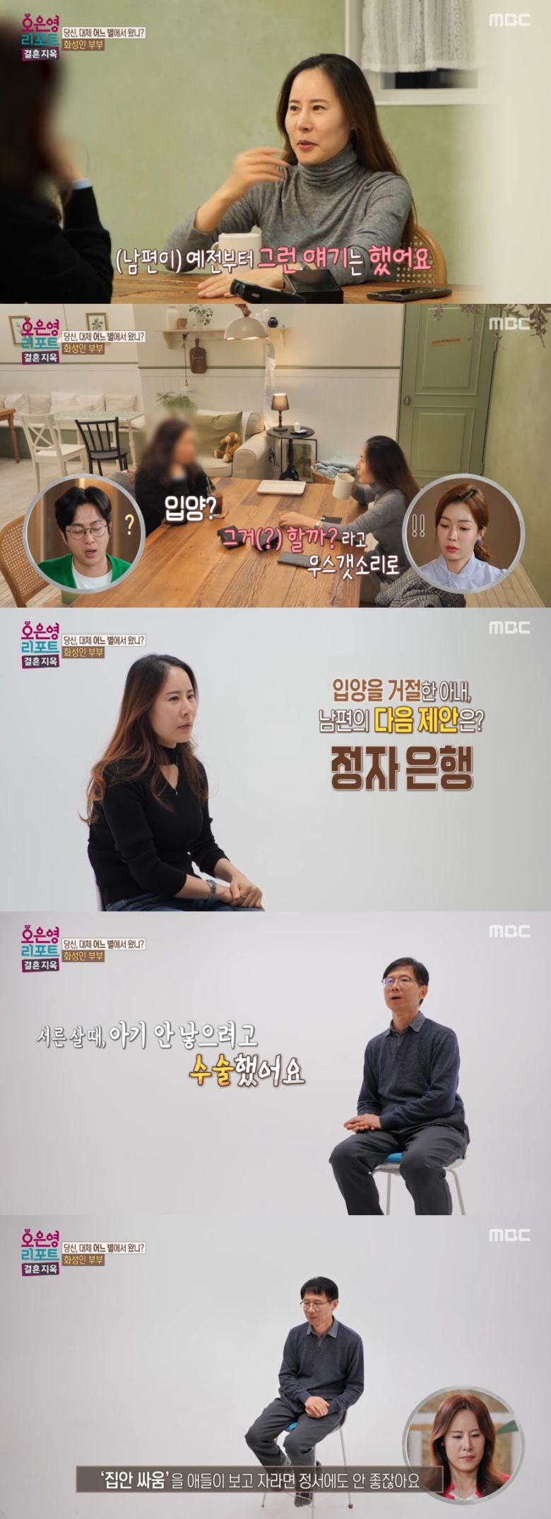 또한 두 사람은 2세 계획에서도 마찰이 있었다. 아내는 "예전부터 그런 얘기를 했다. '입양할까?'라고 우스갯소리로"라며 "남편은 제가 자꾸 아이 갖고 싶다고 하니까 '입양하자' 처음에는 입양하자는 얘기를 했다"라고 말했다.