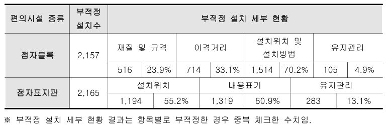 일례로 한시련의 2024년 전국 257개 보건소 전수 조사 (이전 공사로 광주동구보건소 제외) 결과를 살펴보면, 전국 소재 보건소 시각장애인 편의 시설 항목의 부적정 설치율은 42.2%, 미설치율은 15.9%였습니다. 특히 안내시설에 해당하는 점자 블록과 시·청각장애인용 피난구유도등의 미설치율은 53.7%, 점자 블록의 부적정 설치율은 70.2%에 해당했습니다. 점자 표지판의 경우, 60.9%가 설치물과 다르게 내용이 표기되는 등 '부적정 설치'된 것으로 나타났습니다.