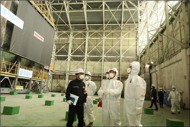 김성훈 인천환경공단 이사장과 직원들이 송도자원순환시설 집진시설을 점검하고 있다. 인천환경공단 제공. |